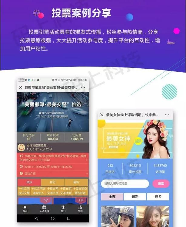 投票活動(dòng)能最大程度地激發(fā)大伙的競爭意識,讓參與者通過(guò)微信圈好友轉發(fā)讓越來(lái)越多的人參與進(jìn)來(lái)。例如,萌娃,萌寵,攝影,服裝,美食,婚紗,優(yōu)秀員工等各行各業(yè)的投票評選活動(dòng),是你推廣產(chǎn)品,公眾號吸粉,營(yíng)銷(xiāo)宣傳的第一選擇。而在幫自家選手拉票的同時(shí),企業(yè)廣告也能通過(guò)社交渠道得到最大程度的曝光。投票活動(dòng)在帶動(dòng)用戶(hù)參加的同時(shí),還可以吸引更多的微信粉絲。