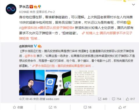 此外,羅永浩針對“騰訊要投資子彈短信一事”作出回應:由于我們團隊的人生性愚鈍,還喜歡自作多情,加上八月二十一號開(kāi)始找我們的 50 多家機構,都是各種投資基金和大企業(yè)的投資部來(lái)談投資再加上對方是騰訊投資部的,而不是“騰訊融資部”的,所以我們把這個(gè)理解成了騰訊是想談投資合作的可能性。