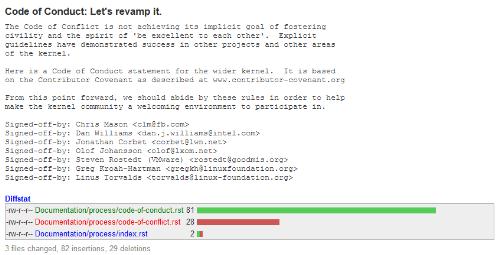 以前 Linux Kernel 有一個(gè)“沖突代碼(Code of Conflict)”,有些人可能認為內容相當嚴苛。 但現在它已被“行為準則”所取代,該行為準則源自 X.Org Foundation / FreeDesktop.org 項目等使用的貢獻者公約。
