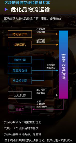 以?;肺锪鳛槔?,通過(guò)接入百度云區塊鏈平臺,可以回溯貨物運輸鏈條的每一個(gè)環(huán)節,諸如?;房ㄜ?chē)行駛軌跡、貨運司機不當操作、公證機構的車(chē)證機制及數字簽名、交通廳監管信息等等,從而做到資源運輸全程的監管可控,同時(shí),基于線(xiàn)路和數據的貨運調度優(yōu)化,也可以提高企業(yè)運營(yíng)效率和員工收入。