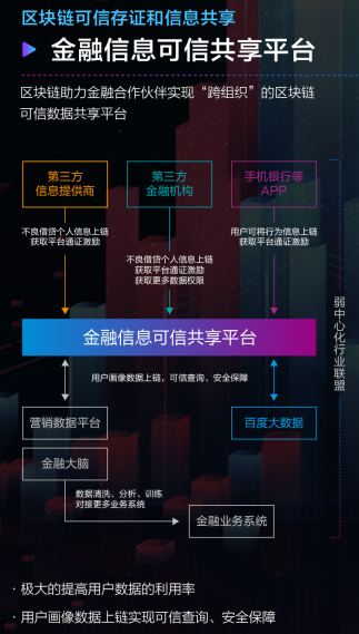 在金融信息共享方面,百度云區塊鏈平臺能夠打通第三方信息提供商、金融機構與用戶(hù),促成交易、不良貸款等信息及時(shí)上鏈,并結合百度云的用戶(hù)畫(huà)像、金融大腦、大數據等能力,對上鏈數據進(jìn)行清洗、分析和訓練,對接更多金融系統,極大提升金融數據的利用率。