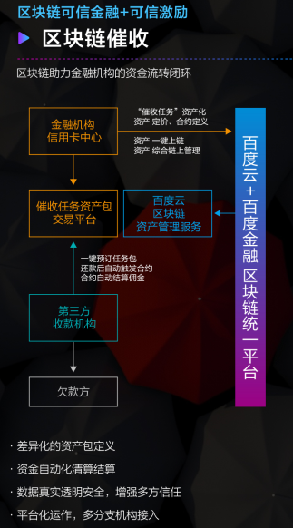 在金融催收場(chǎng)景中,百度云與金融機構共建區塊鏈催收任務(wù)分包平臺,通過(guò)差異化資產(chǎn)包與催收任務(wù)的統一上鏈與管理,實(shí)現全流程的信息共享、真實(shí)和透明,借助鏈上合規通證體系,為第三方合作伙伴構建了一套以貢獻度為準的激勵體系,同時(shí)規避了以往招投標、結款等繁瑣流程,大大提升了催收效率和平臺信任度。此外,通過(guò)接入智能合約,根據合約定義執行催收任務(wù),實(shí)現資金自動(dòng)化的結算清算,有效規避了規范混亂和結算周期長(cháng)等行業(yè)痛點(diǎn)。