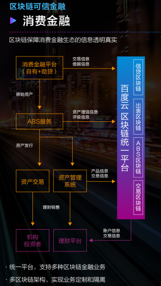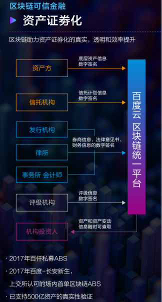 在消費金融場(chǎng)景中,百度云統一區塊鏈平臺支持信貸、出表、ABS 和交易等多類(lèi)型區塊鏈金融業(yè)務(wù),實(shí)現業(yè)務(wù)定制與隔離。在資產(chǎn)證券化方面,百度云區塊鏈將底層資產(chǎn)信息數字簽名、信托計劃數字簽名等信息統一上鏈,目前已支持 500 億資產(chǎn)的真實(shí)性驗證。