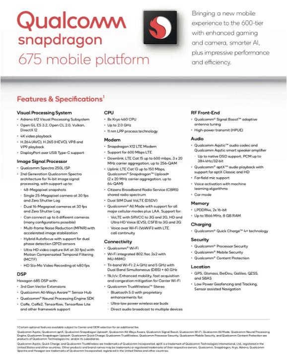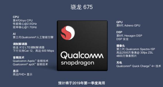 只不過(guò),作為一款中端產(chǎn)品,高通自然不會(huì )將所有的好東西都放到上面去。例如,驍龍675只支持最高X12的基帶,最高傳輸速度為下行600Mbps,只支持FHD+的屏幕分辨率,GPU型號為Adreno 612,命名上來(lái)看規格可能比驍龍670還要低一些。