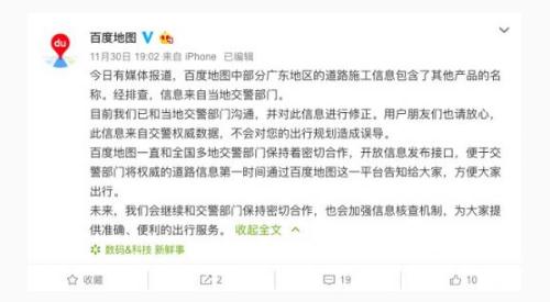 百度地圖稱(chēng),自己一直和全國多地交警部門(mén)保持著(zhù)密切合作,開(kāi)放信息發(fā)布接口,便于交警部門(mén)將權威的道路信息第一時(shí)間通過(guò)百度地圖這一平臺告知給大家,方便大家出行。未來(lái),我們會(huì )繼續和交警部門(mén)保持密切合作,也會(huì )加強信息核查機制,為大家提供準確、便利的出行服務(wù)。