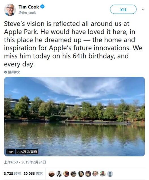 如果史蒂夫·喬布斯還活著(zhù),那么今天就是他的 64 歲生日。蘋(píng)果現任 CEO 蒂姆·庫克發(fā)布推文紀念喬幫主,推文中寫(xiě)道:“我們工作生活的 Apple Park 園區處處體現了史蒂夫的愿景。如果他還在的話(huà),應該會(huì )非常喜歡這個(gè)他夢(mèng)寐以求的地方-蘋(píng)果未來(lái)創(chuàng )新的家園和靈感源泉。今天是他 64 歲的生日,我們無(wú)時(shí)無(wú)刻不在想念他。”