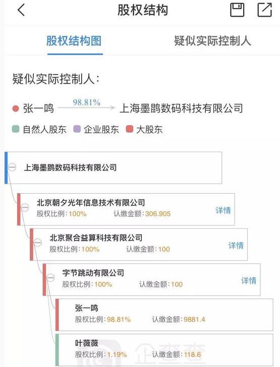 該公司在企查查的更新消息顯示,目前上海墨鹍數碼科技有限公司(下文稱(chēng)“上海墨鹍”)的法定代表人已改為今日頭條的高級副總裁張利東。從上海墨鹍現有的股權結構來(lái)看,字節跳動(dòng)有限公司已經(jīng)成為上海墨鹍的控股公司。