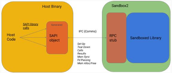 生成的 SAPI 對象的 API 類(lèi)似于原始庫的 API,不過(guò)會(huì )有額外的代碼出現。這些代碼用來(lái)設置沙箱,以及將內存傳入和傳出沙箱。但除此之外,代碼流保持不變。