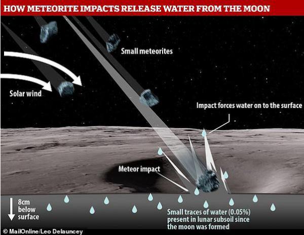 當一顆隕星高速撞擊月球表面,它一般會(huì )在撞擊的一瞬間由于高溫而蒸發(fā)掉,同時(shí)撞擊將產(chǎn)生一次強烈的沖擊波在月壤中傳播。如果一次撞擊的規模足夠大,這種沖擊波可能會(huì )造成表層干粉狀月壤層產(chǎn)生裂隙,并讓下層較為潮濕的含水層中的水分子得以釋放。