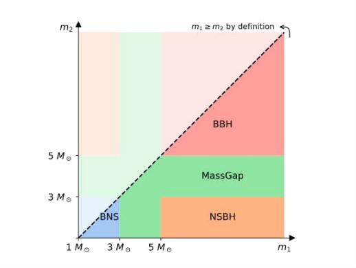 為了弄清楚究竟是哪種合并,天文學(xué)家通過(guò)分析引力波數據估計出碰撞中每個(gè)物體的質(zhì)量然后弄清楚它們分別是什么。如果兩個(gè)物體的質(zhì)量都在 1 到 3 個(gè)太陽(yáng)質(zhì)量之間,那么它們很可能是中子星。如果兩個(gè)黑洞的質(zhì)量都大于 5 個(gè)太陽(yáng)質(zhì)量,那么這個(gè)事件很有可能跟兩個(gè)黑洞有關(guān)。