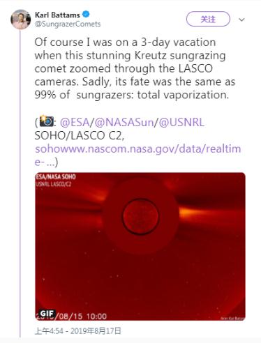 Battams 發(fā)推文稱(chēng):“全部汽化。” 但在隨后的推文中,Battams 解釋說(shuō)這些彗星并不一定能擊中太陽(yáng)。當它們靠近太陽(yáng)時(shí),它們會(huì )瞬間消失,只會(huì )留下了一道發(fā)光條紋。