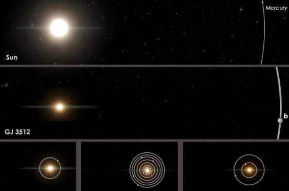 紅矮星 GJ 3512 和其新近識別出的氣態(tài)巨行星 GJ 5312b,它們與太陽(yáng)系和其他鄰近的紅矮星系統的軌道比較。