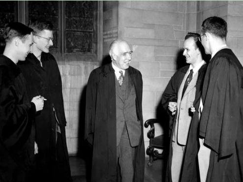 休·埃弗里特(右二)創(chuàng )立了多世界理論。(圖上從左至右分別為:查爾斯·米斯納(Charles Misner)、黑爾·特羅特(Hale Trotter)、尼爾斯·玻爾和大衛·哈里森(David Harrison))