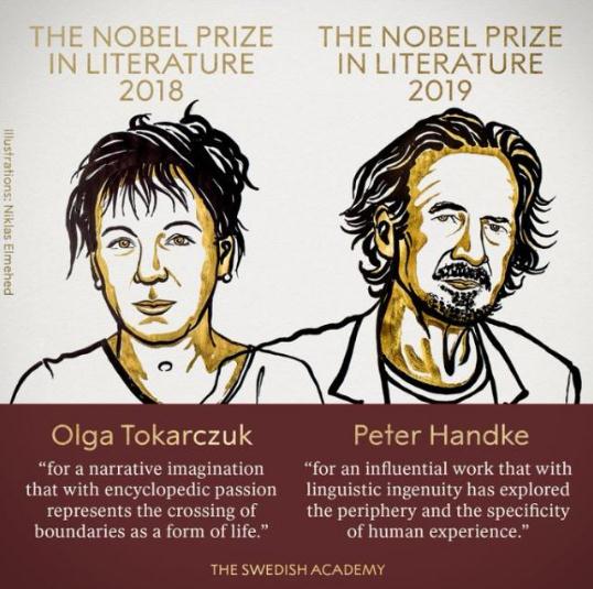 10月10日,瑞典文學(xué)院正式宣布,將2018年諾貝爾文學(xué)獎授予波蘭女作家?jiàn)W爾加·托卡爾丘克,將2019年諾貝爾文學(xué)獎授予奧地利作家彼得·漢德克。