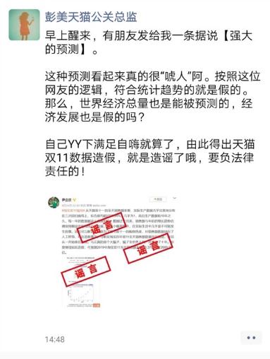 針對網(wǎng)友的質(zhì)疑,天貓公關(guān)總監回應表示,“按照網(wǎng)友的邏輯,符合統計趨勢的就是假的。那么,世界經(jīng)濟總量也是能被預測的,經(jīng)濟發(fā)展也是假的嗎?自己 YY 下滿(mǎn)足自嗨就算了,由此得出天貓雙 11 數據造假,就是造謠了哦,要負法律責任的!”