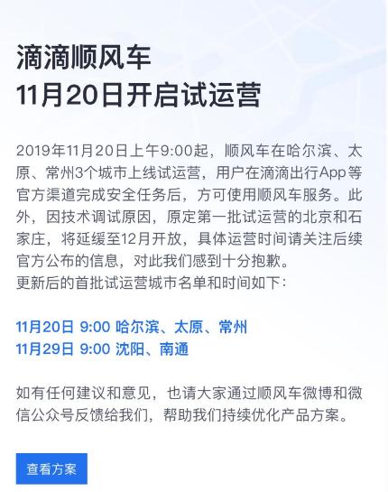 11 月 6 日,滴滴公布了滴滴順風(fēng)車(chē)最新產(chǎn)品方案,并宣布滴滴順風(fēng)車(chē)于 11 月 20 日陸續在陸續在哈爾濱、太原、石家莊、常州、沈陽(yáng)、北京、南通 7 個(gè)城市上線(xiàn)試運營(yíng)。