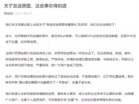 官方表示,微信發(fā)原圖或泄露位置信息這個(gè)話(huà)題已經(jīng)不是第一次辟謠了,2017 年他們就有關(guān)相關(guān)辟謠,詳細內容如下:
