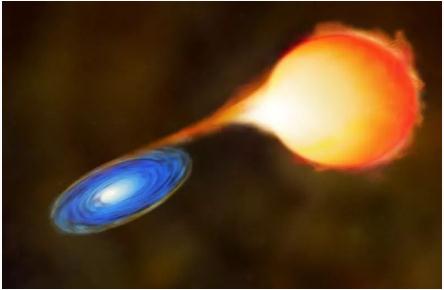 某些情況下,恒星會(huì )在消耗掉所有的氫和氦燃料后走向他們生命的盡頭,并形成超新星。這類(lèi)超新星被稱(chēng)為“II 型超新星”。根據質(zhì)量的不同,恒星的遺骸會(huì )形成中子星或是黑洞。而在其他大多數情況下,恒星會(huì )成為超新星是因為它們吸走了其雙星伴侶的物質(zhì),這就是“I型超新星”。此時(shí),雙星系統中的一方已經(jīng)邁過(guò)超新星階段,形成白矮星或黑洞;當其伴星按主序膨脹為紅巨星時(shí),白矮星或黑洞的引力就開(kāi)始吸積紅巨星表面的物質(zhì),并把紅巨星逐漸拽成“盤(pán)子”形狀。隨著(zhù)時(shí)間流逝,白矮星/黑洞從紅巨星那里吸走的物質(zhì)越來(lái)越多,直至無(wú)法承受,在核心引發(fā)一場(chǎng)逃逸核聚變,形成超新星。無(wú)論是哪種超新星,其爆發(fā)達到的亮度都可與整個(gè)星系的亮度相匹敵。