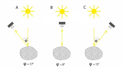 相角(在圖中標記為“φ”)是從目標對象本身(火衛一)觀(guān)察到的光源(在這里為太陽(yáng))與觀(guān)察者(“火星快車(chē)”)之間的角度。在火衛一的影片中,初始相位角為 17 度(圖A),在中途下降到幾乎零度(當火衛一最亮時(shí),圖B),然后在動(dòng)畫(huà)結束時(shí)上升到 15 度(圖C)。