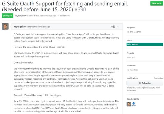 為此,FreeScout 團隊向 Google 提出了 Issue,不過(guò)目前還未得到 Google 的回應。