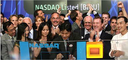 2005 年 8 月,百度正式掛牌納斯達克證劵交易所,發(fā)行價(jià)為 27 美金。開(kāi)盤(pán)價(jià)為 66 美金,IPO 首日收盤(pán)于 122.54 美金,漲幅高達 354%,創(chuàng )當時(shí)美國股市 5 年來(lái)新高,市值達 39.58 億美金,為中概股最輝煌記錄之一。