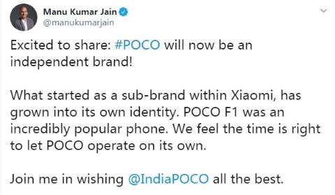 今天下午,小米全球副總裁、小米印度業(yè)務(wù)總負責人 Manu Kumar Jain 在推特宣布,POCO 品牌獨立。
