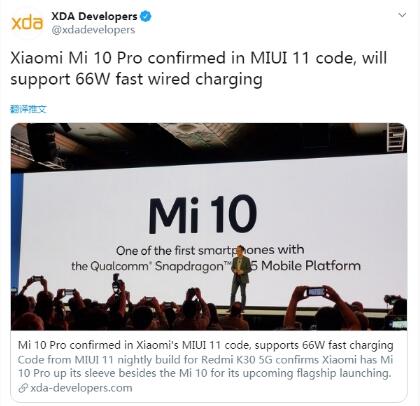 1月29日消息,XDA通過(guò)MIUI11代碼確認,小米10Pro將支持66W有線(xiàn)超級快充。