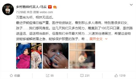 繼日本之后,今日,馬云在微博宣布,向伊朗捐贈 100 萬(wàn)只口罩。