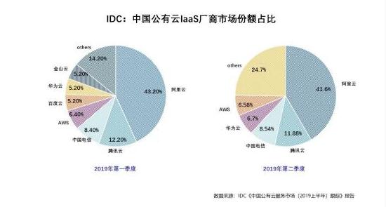 1. 在 2019 年 Q2,阿里云份額拿到了 43% 的低點(diǎn),同期騰訊云占到 17.2%,差距縮小;