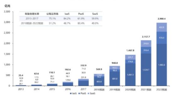 從大概規???,若以中國信通院數據為參考,IaaS 層 270 億元的規模同比增速若在 70%,則 2019 年為 459 億元,2018 年 PaaS 層的 22 億元,到 2019 年大概為 45 億元。