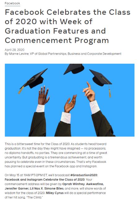 據外媒 The Verge 報道,受新冠肺炎疫情影響,全世界的學(xué)生們可能都要錯過(guò)親臨現場(chǎng)的畢業(yè)典禮,所以 Facebook 決定舉辦自己的畢業(yè)典禮。這家社交媒體平臺周二宣布,它將于 5 月 15 日在 Facebook 上流媒體直播畢業(yè)典禮,屆時(shí)將有來(lái)自?shī)W普拉·溫弗瑞(Oprah Winfrey)的演講,以及 Awkwafina、Jennifer Garner、Lil Nas X 和 Simone Biles 的小型演講。Miley Cyrus 也將參加演出。雖然該節目將在 Facebook 上播出,但精選的片段也將顯示在 Instagram 上。