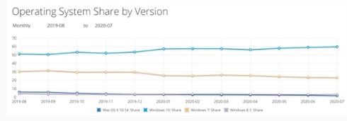 報告顯示,今年 7 月份 Windows 10 的全球市場(chǎng)份額為 59.59%,逼近 60%,高于上個(gè)月的 58.93%。 Windows 7 份額繼續下滑,從 23.35% 下降到 23.11%。
