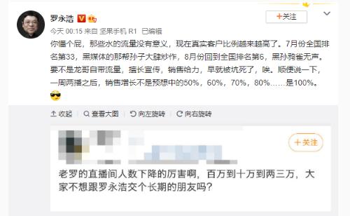 羅永浩表示,7 月份全國排名第 33,被大肆炒作,8 月份回到全國排名第6,結果黑粉就鴉雀無(wú)聲了。