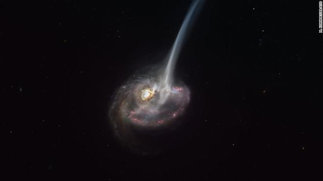 這個(gè)星系的消亡可能是由于與其他星系碰撞所致。碰撞可能導致氣體損失的有力證據是“潮汐尾巴”的形成,后者是兩個(gè)星系碰撞后延伸到太空中的氣體和恒星形成的長(cháng)流。通常情況下,這些潮汐尾巴在如此遙遠的地方難以看到,但天文學(xué)家們能夠在明亮的尾巴延伸到太空時(shí)觀(guān)察到它。