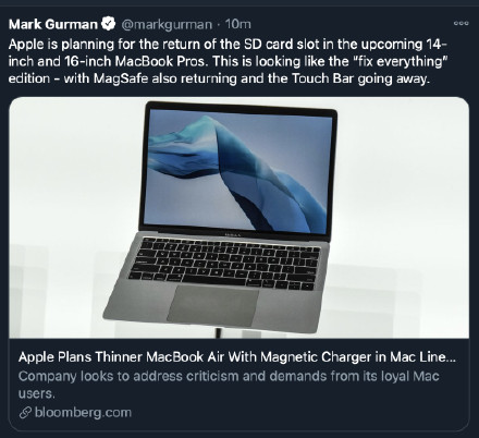 同時(shí),Gurman 此前還確認 MagSafe 磁吸充電口在 MacBook Pro 上的回歸,并表示 MagSafe 將帶來(lái)比以往更快的充電速度。