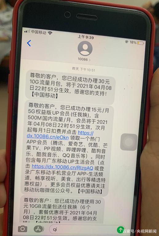 和李先生一樣在等待移動(dòng)回應的,還有上周被“莫名”開(kāi)通流量月包業(yè)務(wù)的楊女士。楊女士表示此前她在參加某APP抽獎時(shí)成功抽到一視頻網(wǎng)站會(huì )員,在輸入手機號和驗證碼后,隨即便收到一條中國移動(dòng)的短信,稱(chēng)其已開(kāi)通了移動(dòng)“30元10G流量月包”套餐。