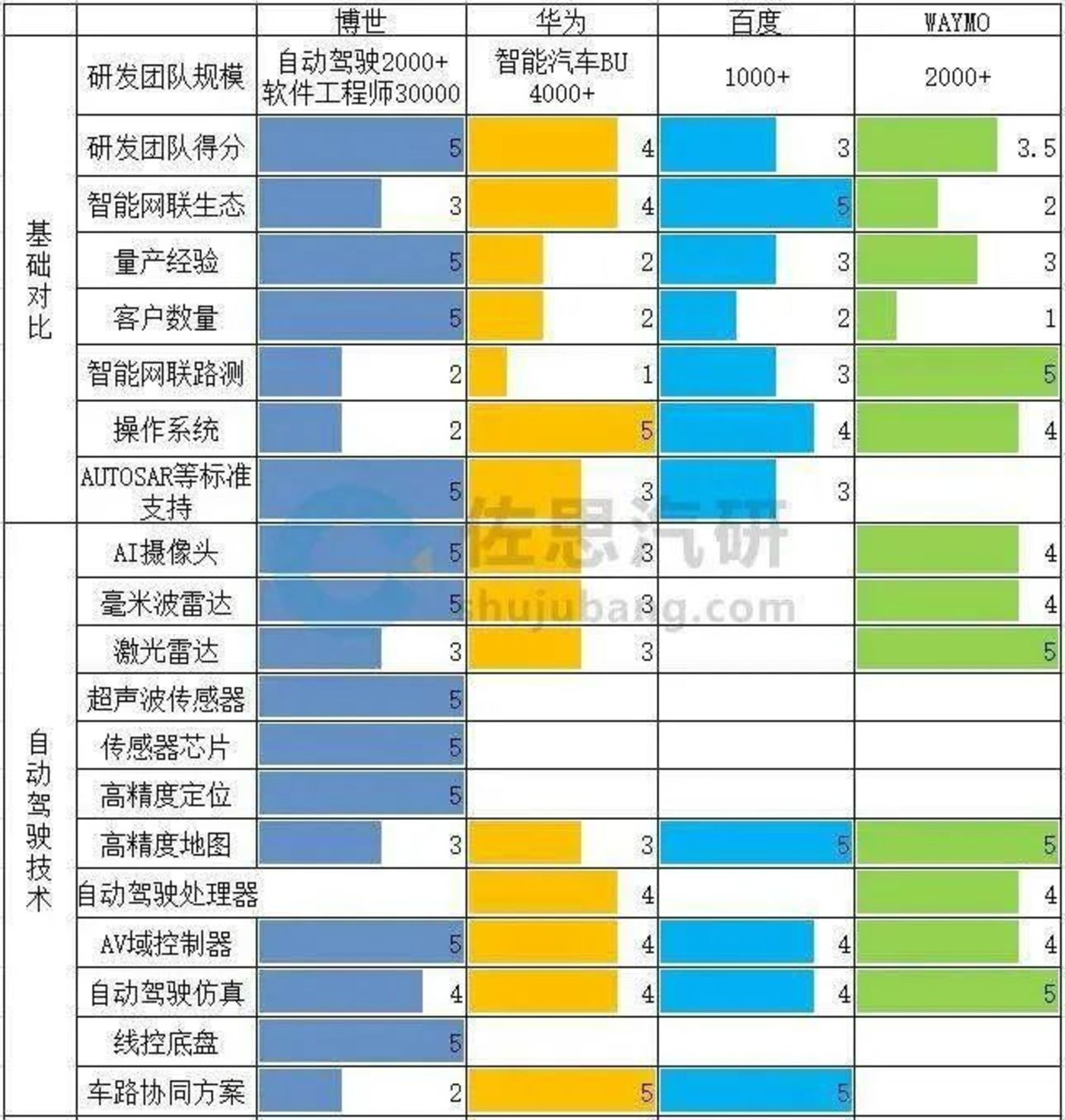 佐思汽研選擇了41項新四化指標對博世、華為進(jìn)行了對比,評估它們作為新四化供應商的能力,結果博世得分161分,華為得分114.5分。