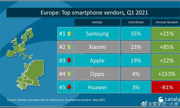 IT之家 5 月 6 日消息 今日早間,小米集團副總裁、手機部總裁曾學(xué)忠發(fā)布微博表示,第一季度歐洲智能手機市場(chǎng)份額小米超過(guò)蘋(píng)果,首次達到第二;西歐智能手機出貨量增速迅猛,市場(chǎng)份額穩居第三;西班牙智能手機市場(chǎng)份額連續五個(gè)季度穩居第一。