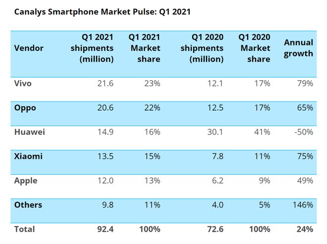 而根據Canalys中國區的報告,在中國市場(chǎng),華為一季度的智能手機發(fā)貨量同比下跌了50%,市場(chǎng)排名從第一下跌至第三位,vivo、oppo、小米分別實(shí)現了79%、65%和75%的增長(cháng);而蘋(píng)果則實(shí)現了49%的增長(cháng),主要來(lái)自于iPhone12的貢獻。