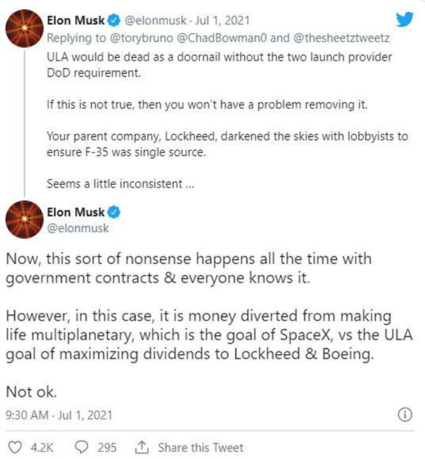 馬斯克在推特上寫(xiě)道:“如果不是美國國防部要求有兩家發(fā)射服務(wù)提供商,ULA早就廢掉了。”他在隨后的推文中補充道:“如果發(fā)生那種情況,SpaceX可以獲得更多資金,推進(jìn)其幫助人類(lèi)成為多行星物種的目標,而不是ULA為洛克希德馬丁和波音公司帶來(lái)更多紅利。”