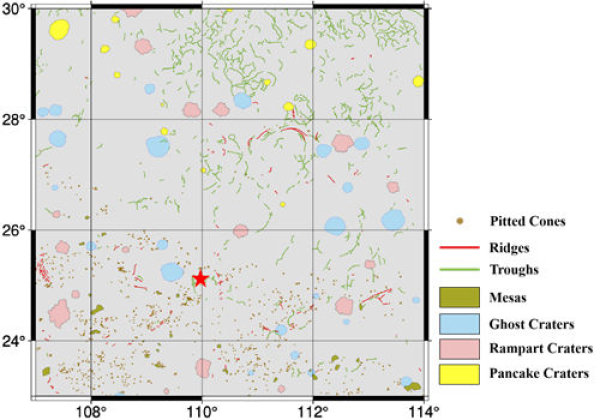 中國科學(xué)院國家空間科學(xué)中心空間天氣學(xué)國家重點(diǎn)實(shí)驗室劉洋研究員團隊綜合運用多源遙感數據對著(zhù)陸區開(kāi)展研究 ,MOLA 高程和粗糙度數據顯示烏托邦平原地形平坦且缺乏明顯撞擊坑,揭示該盆地內部受到長(cháng)期的改造和后期北方荒原 (Vastitas Borealis Formation,VBF) 物質(zhì)堆積。多種地貌特征指示烏托邦平原曾存在大量的水冰/揮發(fā)分,如圖 2 所示,脊狀地貌和凹錐主要分布于研究區西南部,壁壘撞擊坑、薄餅撞擊坑和被掩埋的鬼坑主要分布在中部,多邊形槽聚集在東北部。此外,薄餅狀濺射物遠端部分嚴重退化,表明這些撞擊坑是在含有大量揮發(fā)分的靶體中形成的。不同地貌特征的分布與其距離烏托邦平原中心的距離,即水/揮發(fā)分的含量有關(guān)。