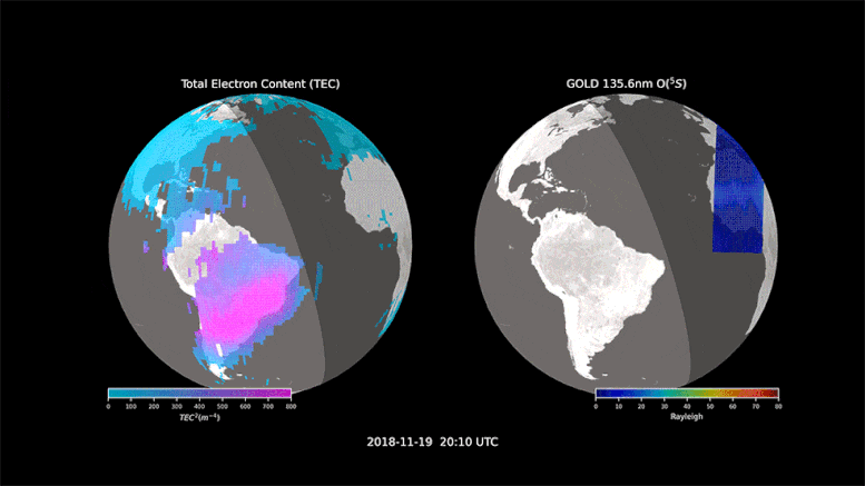GOLD 觀(guān)察的目標之一是被稱(chēng)為赤道電離異?;蚝?jiǎn)稱(chēng) EIA 的帶狀粒子,EIA 根據電離層的條件發(fā)生巨大的變化,而且這些帶狀粒子可以移動(dòng)位置。GOLD 允許科學(xué)家長(cháng)期觀(guān)察這些帶狀粒子。由于 GOLD 的協(xié)助,科學(xué)家能夠觀(guān)察到一些挑戰以前理論的東西。在 2018 年底,南部帶狀粒子更加向南漂移,而北部帶狀粒子保持穩定。