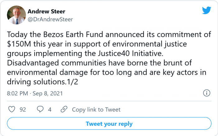 此前,貝佐斯因為沒(méi)有為處于氣候危機前線(xiàn)的社區撥出足夠的資金而遭到活動(dòng)人士的抨擊。在去年的第一輪捐贈中,該基金向環(huán)保組織撥款 7.91 億美元。其中大部分資金都流向了大型環(huán)保組織,包括世界野生動(dòng)物基金會(huì )(WWF)和環(huán)境保護基金會(huì )(EDF),這些組織的資金比注重氣候正義的組織更雄厚。