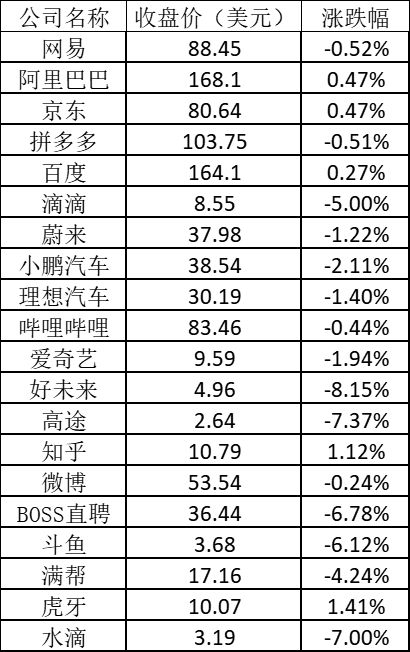 其它熱門(mén)中概股普遍下跌,其中 BOSS 直聘下跌 6.78%,斗魚(yú)下跌 6.12%,滴滴下跌 5.00%,滿(mǎn)幫下跌 4.24%,嗶哩嗶哩下跌 0.44%,知乎上漲 1.12%,百度上漲 0.27%。