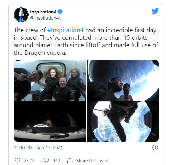 據外媒 CNET 報道,周三離開(kāi)地球的 SpaceX Inspiration4 任務(wù)的機組人員已經(jīng)在太空中度過(guò)了一整天,他們睡覺(jué)、吃飯,甚至還投注了體育比賽。但是,除了一個(gè)關(guān)于 Crew Dragon 透明穹頂窗的預告視頻外,我們還沒(méi)有看到太多關(guān)于他們臨時(shí)軌道家園的狹窄空間的情況。值得慶幸的是,Inspiration 4 任務(wù)官方 twitter 賬號已經(jīng)發(fā)布機組人員在軌道上第一天的圖像,讓我們看到了他們在 Crew Dragon 中的生活。