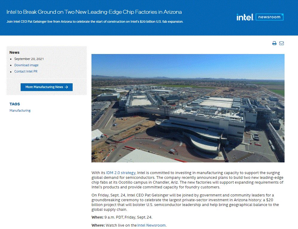 9月23日消息,根據處理器龍頭英特爾(intel) 官方公布的信息指出,英特爾將在美國亞利桑那州興建的兩座新晶圓廠(chǎng),預計9月24 日進(jìn)行動(dòng)土奠基儀式,屆時(shí)英特爾CEO Pat Gelsinger 將會(huì )親自到場(chǎng)出席活動(dòng)。