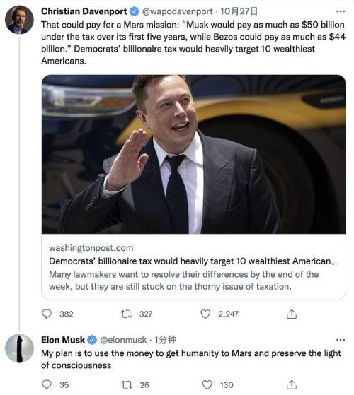 馬斯克在回復華盛頓郵報記者的推文中表示,“我計劃是用這筆錢(qián)(500 億美元)讓人類(lèi)登上火星,保存認知之光。”