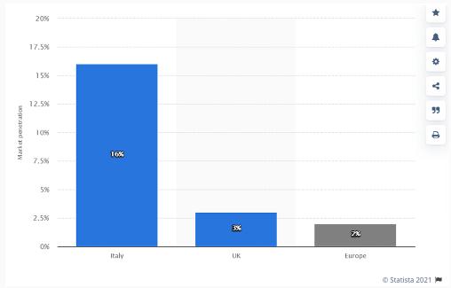 UBI 保險并非新鮮事物,歐美地區在 2015 年左右就有保險公司進(jìn)行過(guò)嘗試和推廣,但至今全球推廣最好的國家意大利也只有 16% 的滲透率 —— 大部分人還是選擇了傳統車(chē)險。
