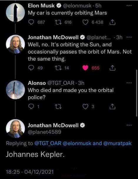 但麥克道爾也因為上述解釋而受到了批評。一位推特用戶(hù)給這位天體物理學(xué)家寫(xiě)道:“是誰(shuí)死了,讓你當軌道警察的?”麥克道爾回復稱(chēng)“約翰內斯·開(kāi)普勒(Johannes Kepler)”。他是 17 世紀的天文學(xué)家,提出了行星運動(dòng)的三大定律。但無(wú)論是繞太陽(yáng)還是火星軌道飛行,馬斯克的跑車(chē)都是一次令人印象深刻的太空旅行。