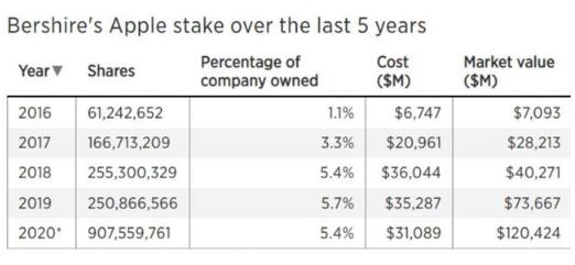 該公司在2020年年報中表示:“伯克希爾對蘋(píng)果的投資生動(dòng)地說(shuō)明了股票回購的力量。盡管我們在2020年出售了蘋(píng)果股票,但伯克希爾現在卻擁有蘋(píng)果5.4%的股份。這一增長(cháng)對我們來(lái)說(shuō)沒(méi)有付出成本,這是因為蘋(píng)果不斷回購其股票,從而大幅縮減了目前的流通股數量。”